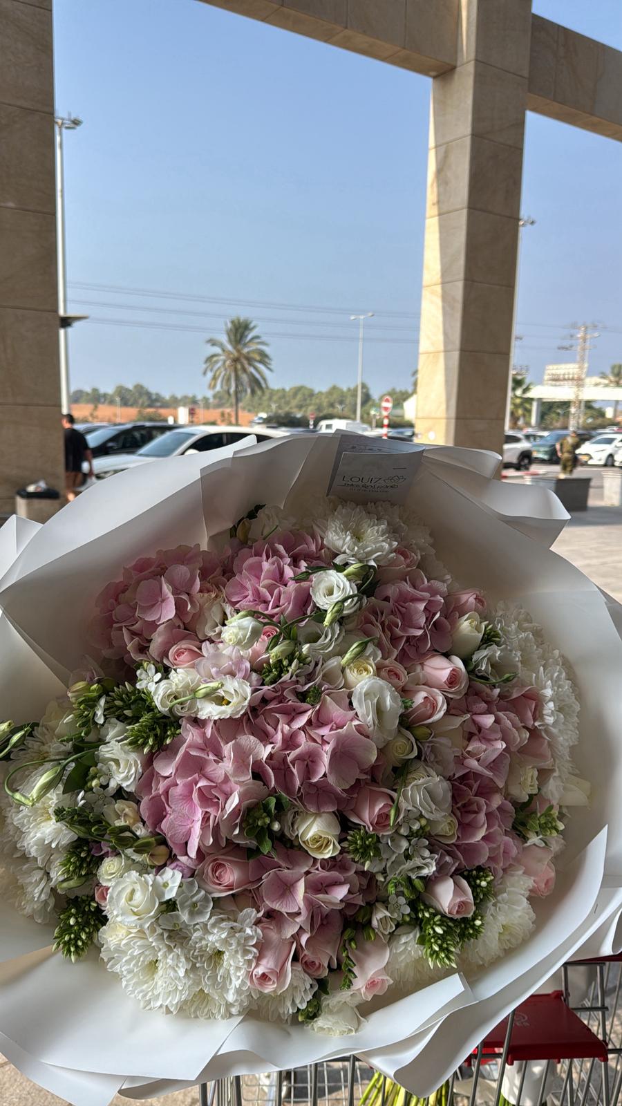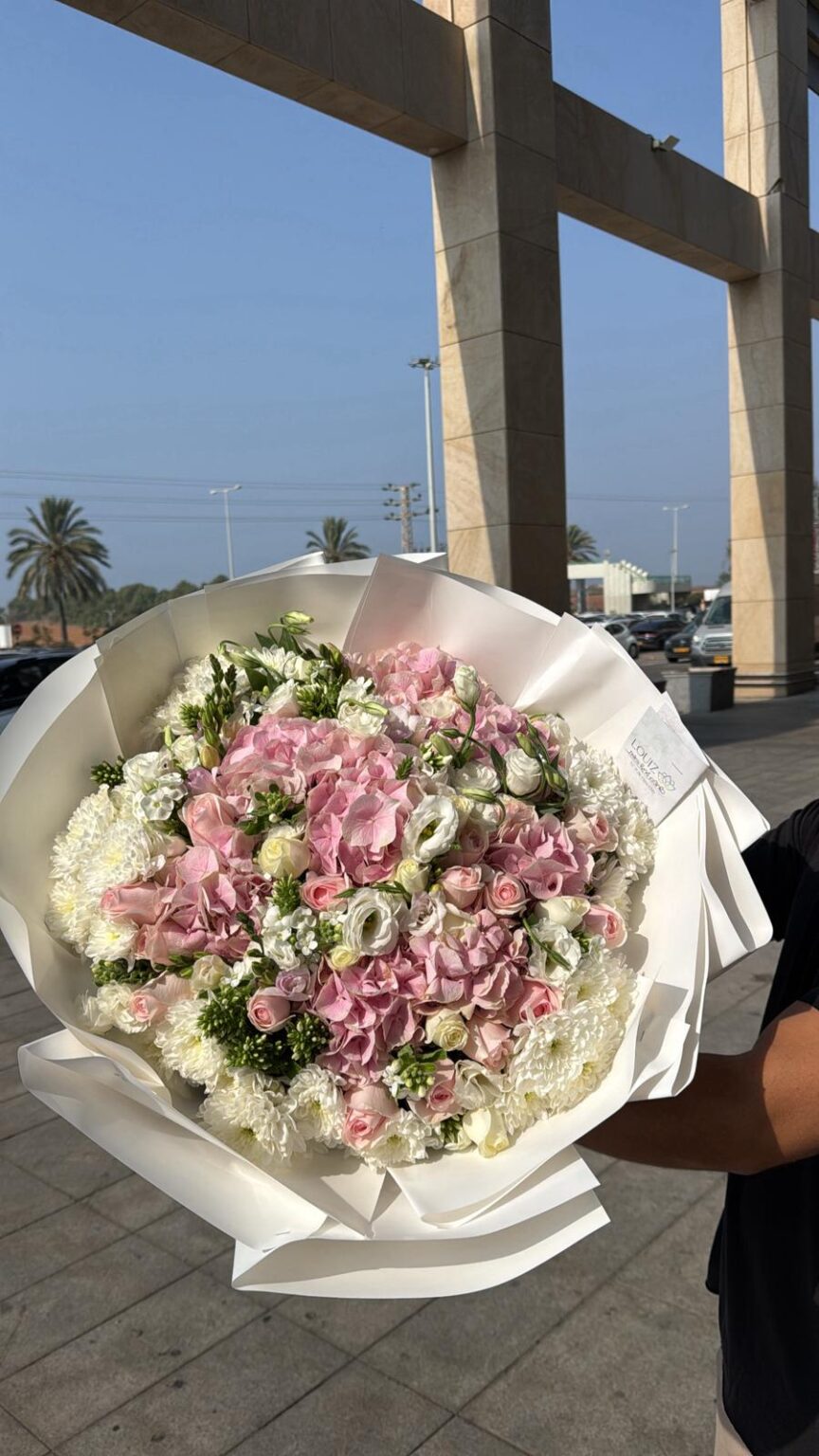 זר היוקרה הורטנזיות ורודות בשילוב ורדים ופרחים לבנים
