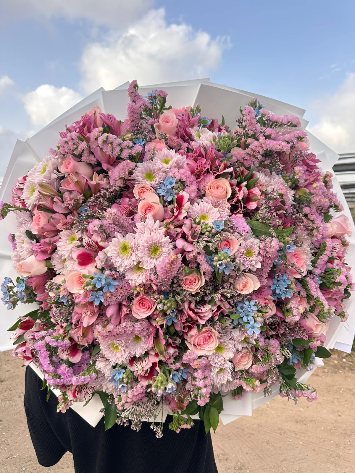 שילוב נדיר של ורדים ורודים מובחרים לצד פרחי אלסטרומריה, עדעד, חרציות הולנדיות, לימוניום ונגיעות עדינות של טוודיה תכלת, יוצר הרמוניה מושלמת של צבעים רכים ומרגשים.